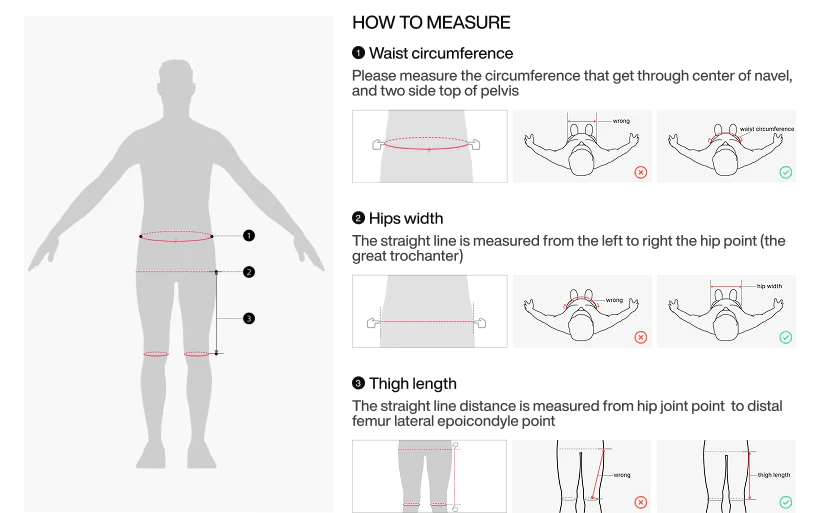 - Thigh Length: Measure vertically from your hip joint down to your outer knee bone.
